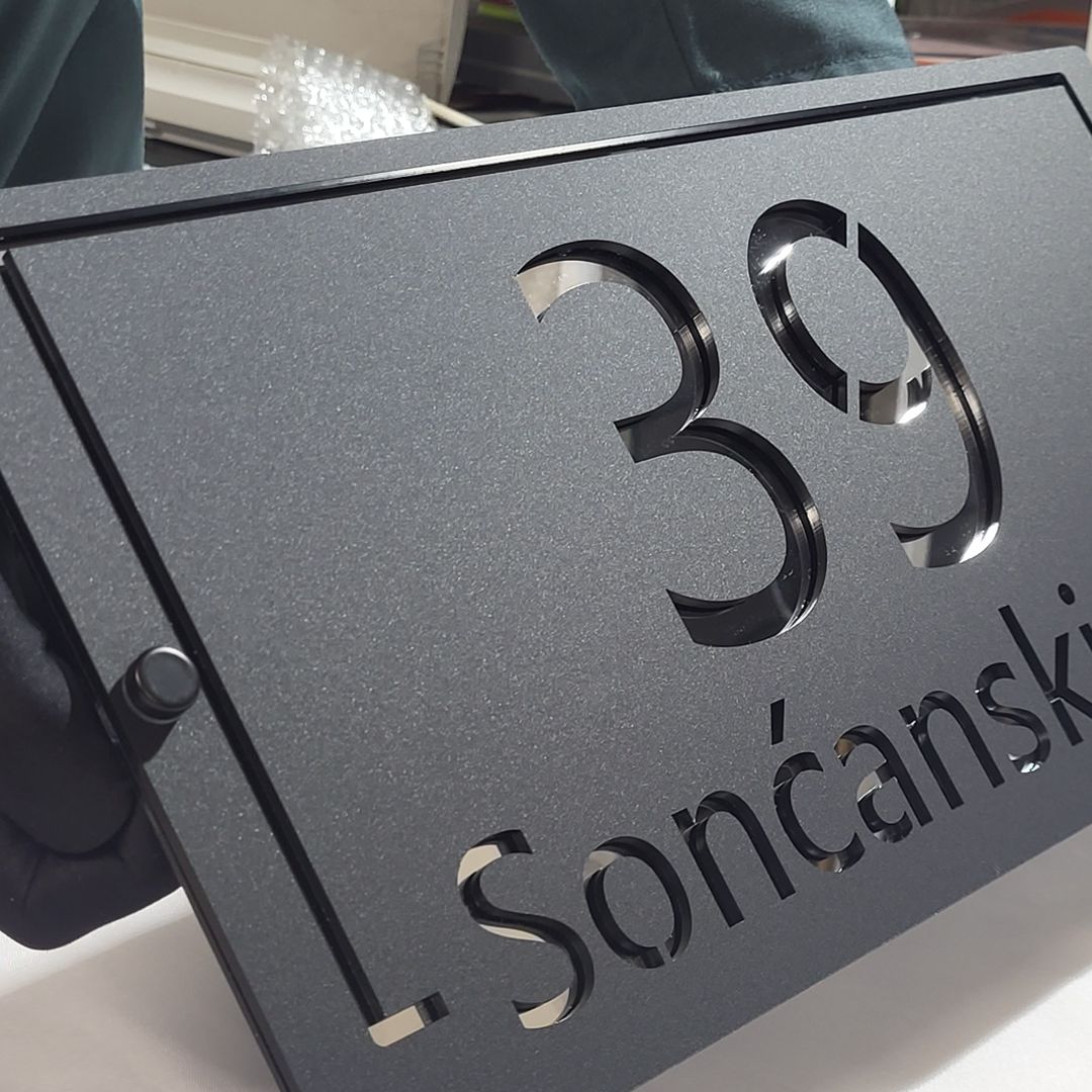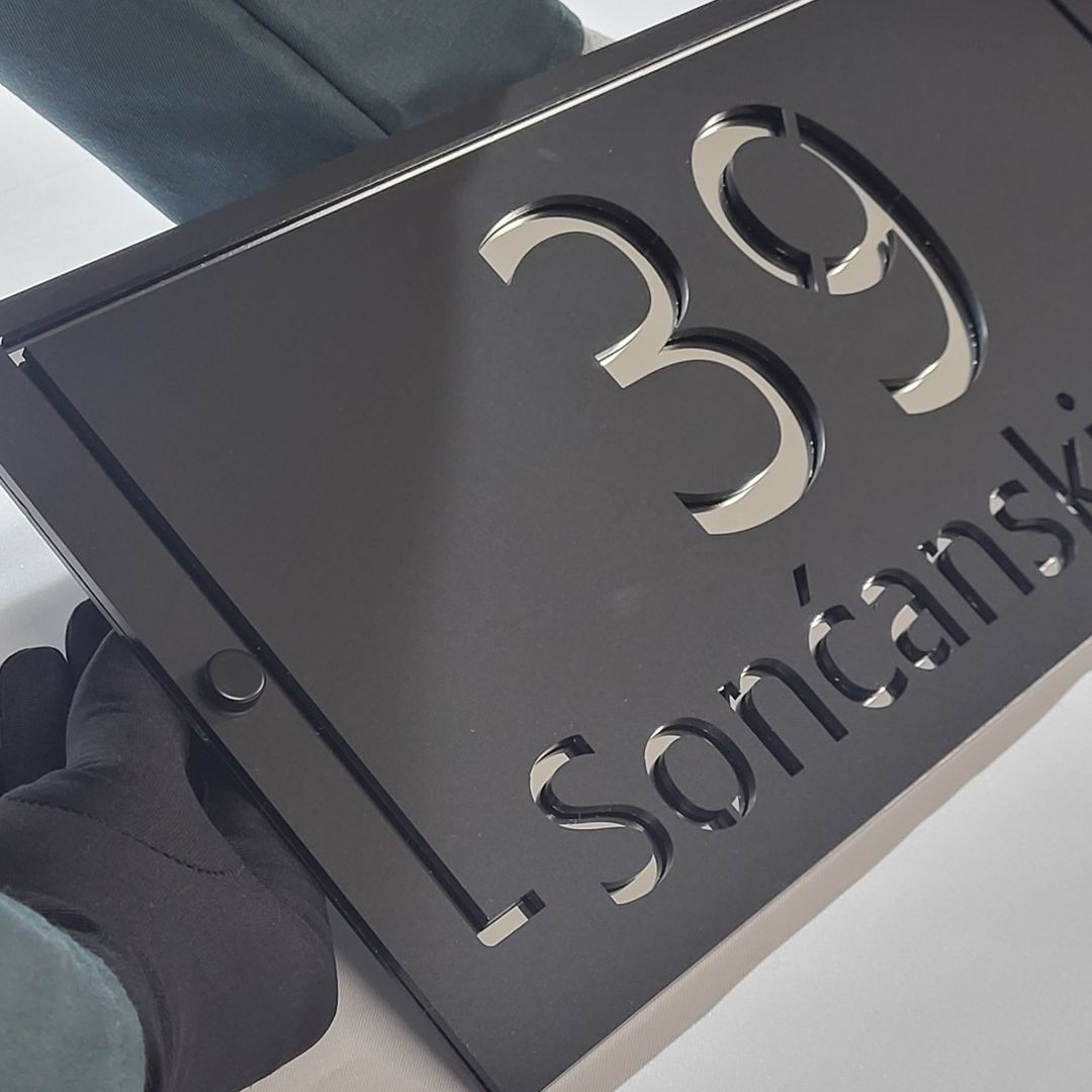 Ekskluzivni kućni broj izrađen od laserski sečenog akrila, modernog dizajna u kombinaciji mat crne i srebrno ogledalo boje.