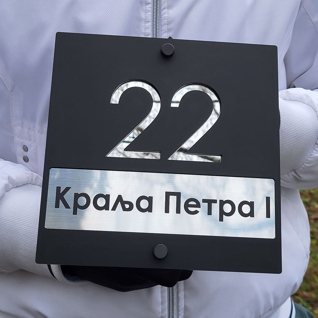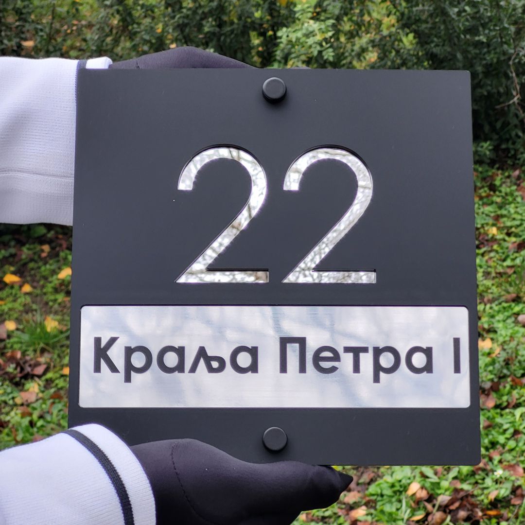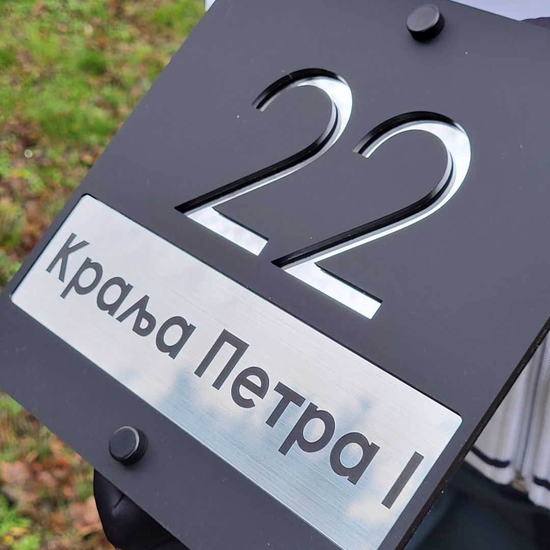Ekskluzivni kućni broj izrađen od laserski sečenog akrila, sa graviranim elementima naziva ulice, modernog dizajna i dugotrajne izrade.