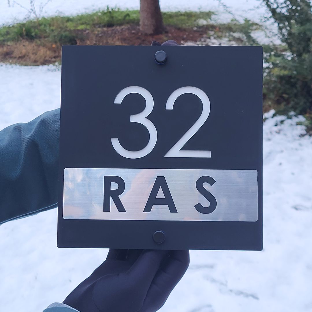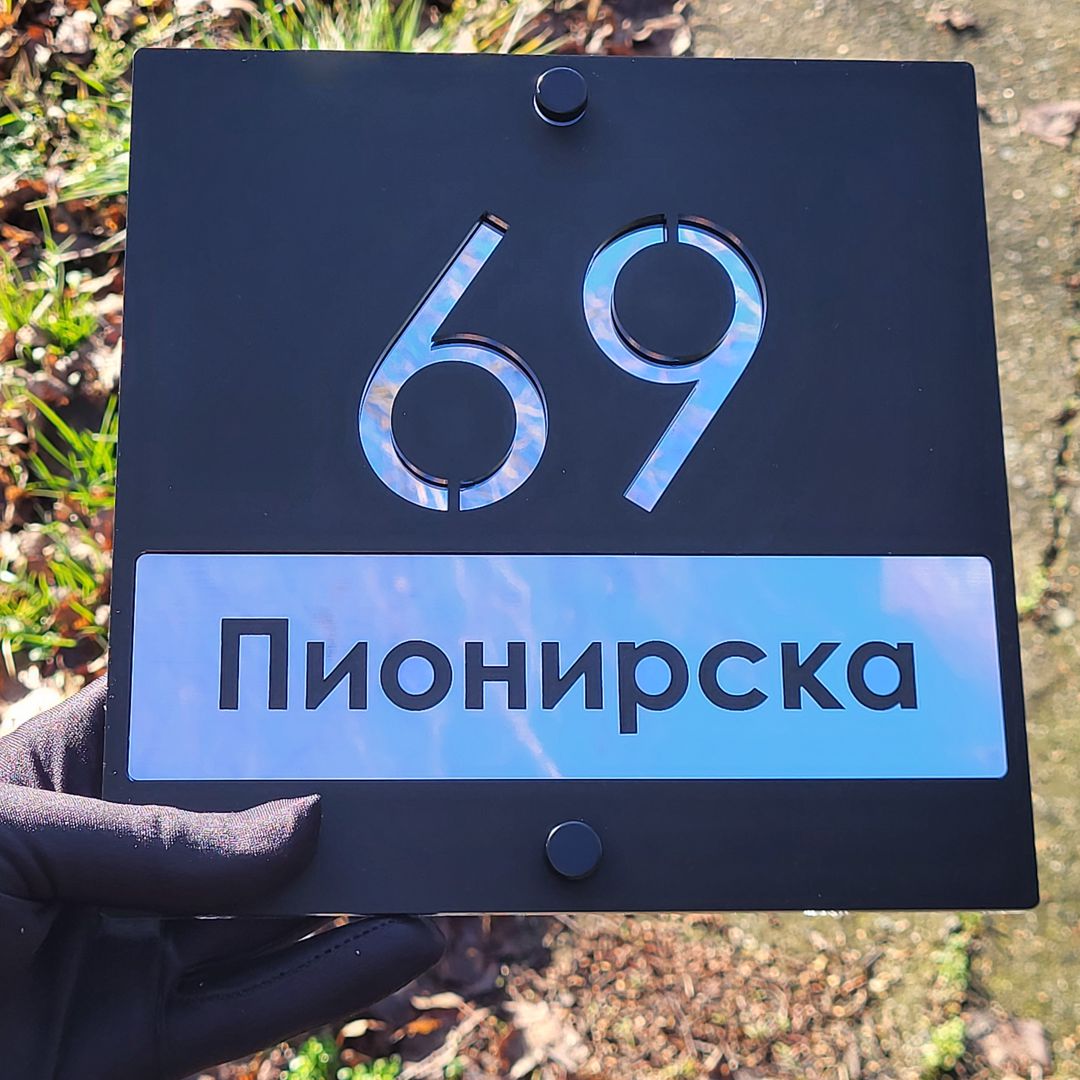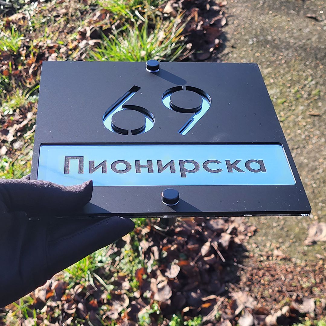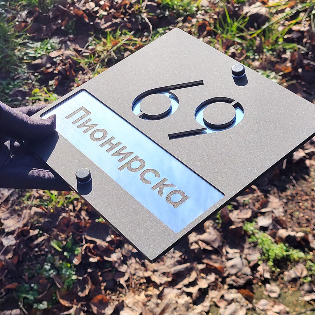 Ekskluzivni kućni broj izrađen od laserski sečenog akrila, sa graviranim elementima naziva ulice, modernog dizajna i dugotrajne izrade.