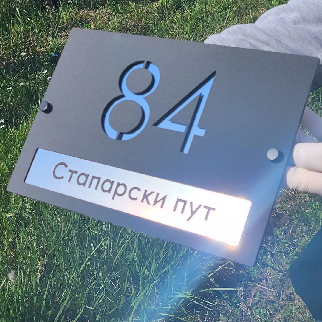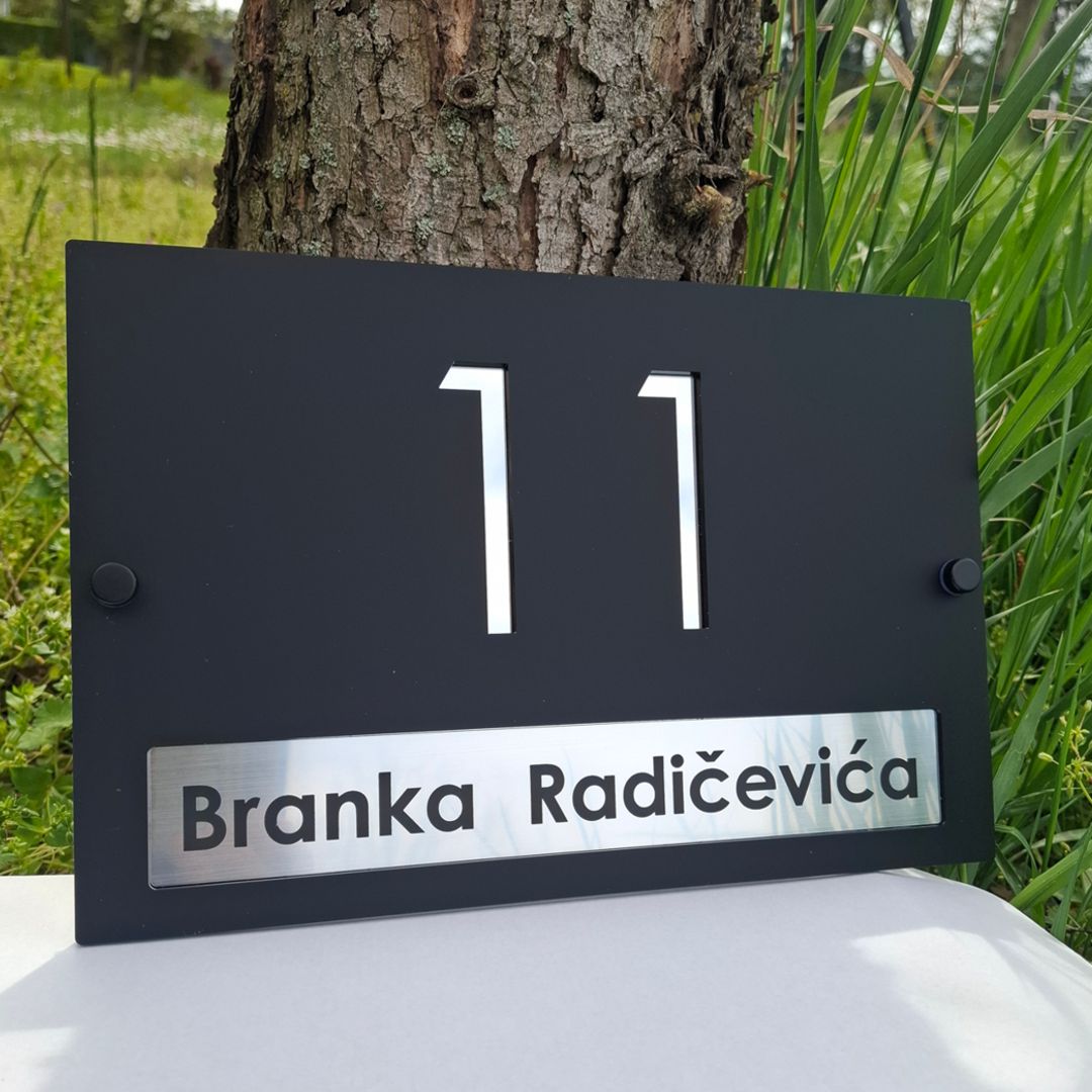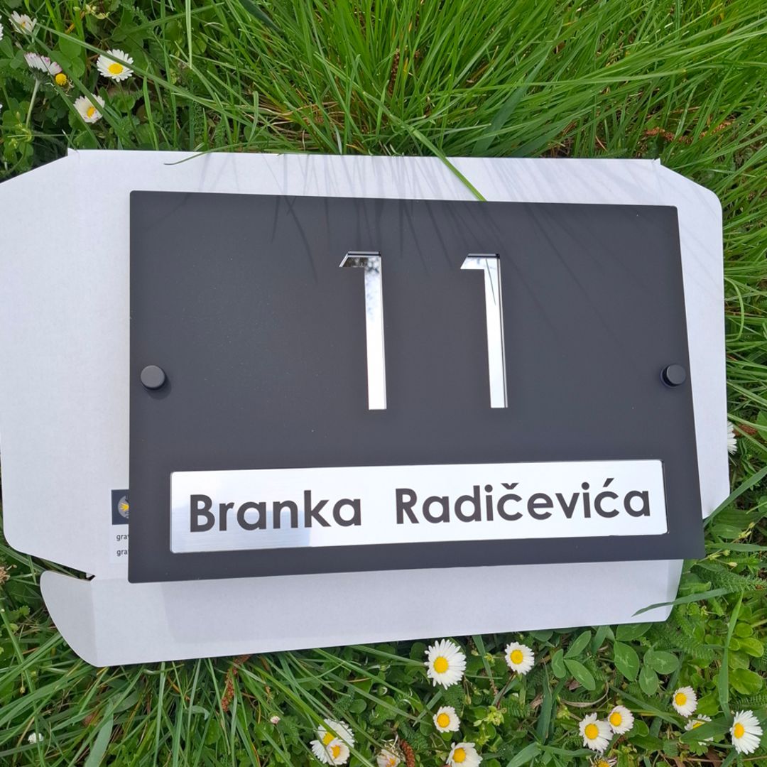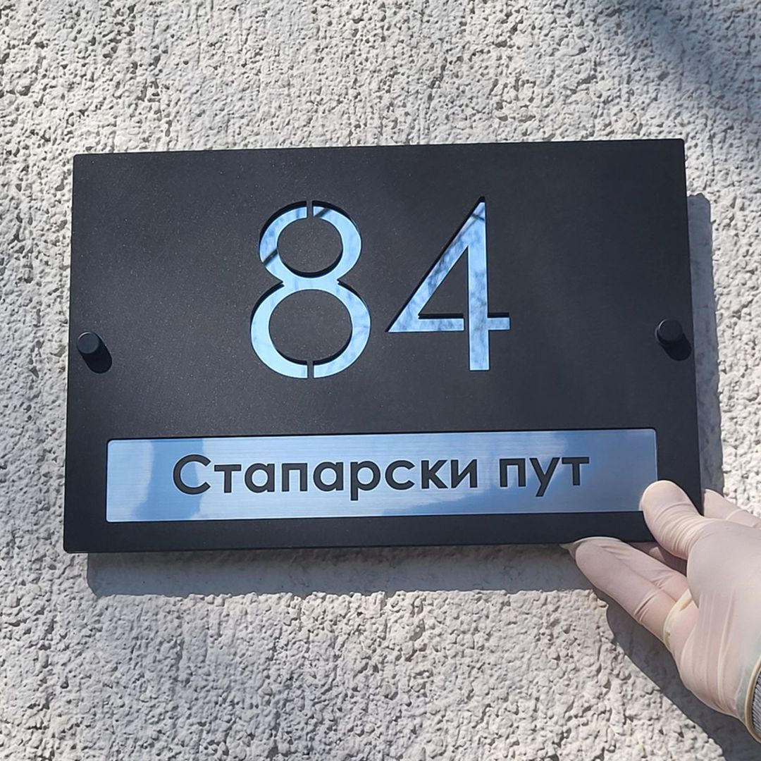Ekskluzivni kućni broj izrađen od laserski sečenog akrila, sa graviranim elementima naziva ulice, modernog dizajna i dugotrajne izrade.