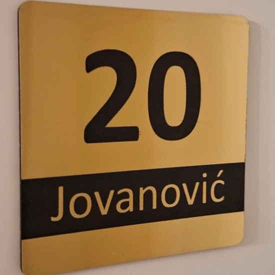 Pločica za vrata jasno ističe broj stana i prezime, obezbeđujući modernu i preglednu identifikaciju.