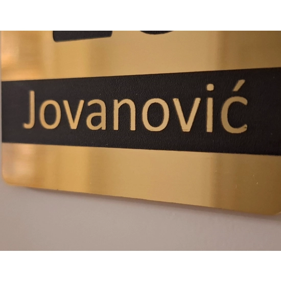 Samolepljivi natpis za vrata sa zaobljenim ivicama, izrađen od premium graverske plastike u zlatnoj i crnoj boji.