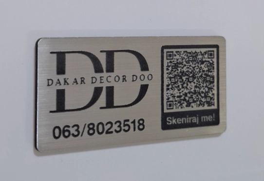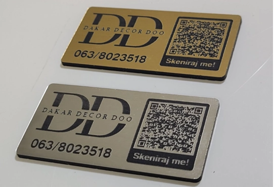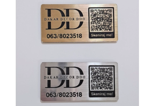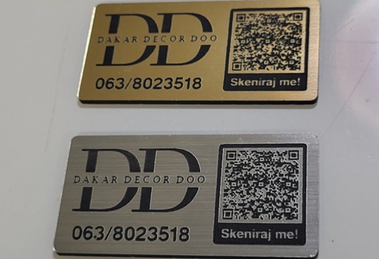 Profesionalni natpisi/poslovne pločice izrađeni laserskim graviranjem na visokokvalitetnoj graverskoj plastici. Svaki komad sadrži logo vaše firme, kontakt telefon i personalizovani QR kod sa pozivom na akciju "Skeniraj me!". Dostupno u elegantnoj kombinaciji zlato-crne i srebro-crne boje, idealno za pultove, izložbene prostore. Izdržljivi, precizno gravirani i otporni na habanje.